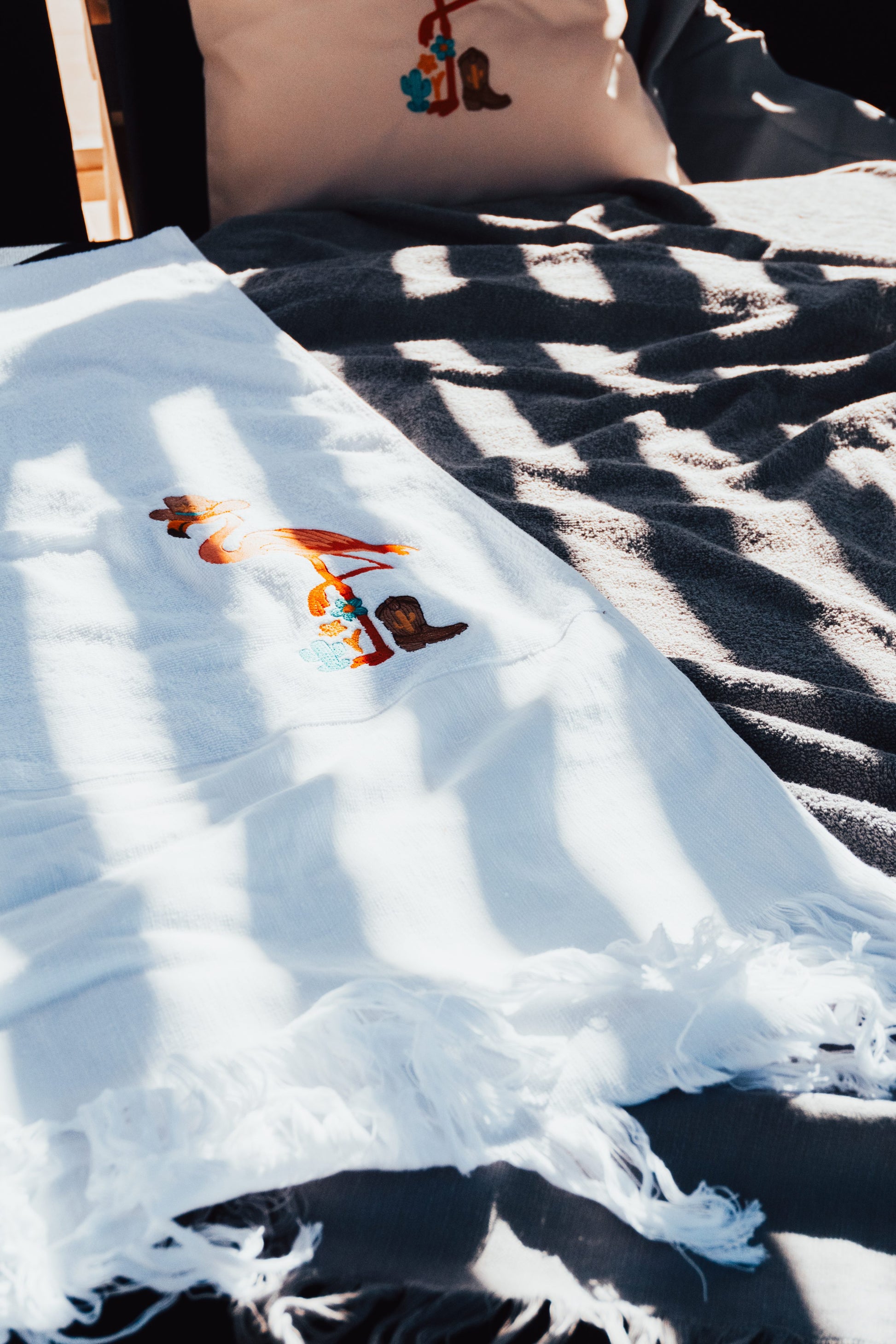 Wrap yourself in summer style with this oversized embroidered beach towel, crafted from 100% soft, breathable cotton. Designed for both comfort and charm, it features playful cowboy-inspired embroidery and boho fringed edges, bringing a relaxed yet refined touch to your summer days.