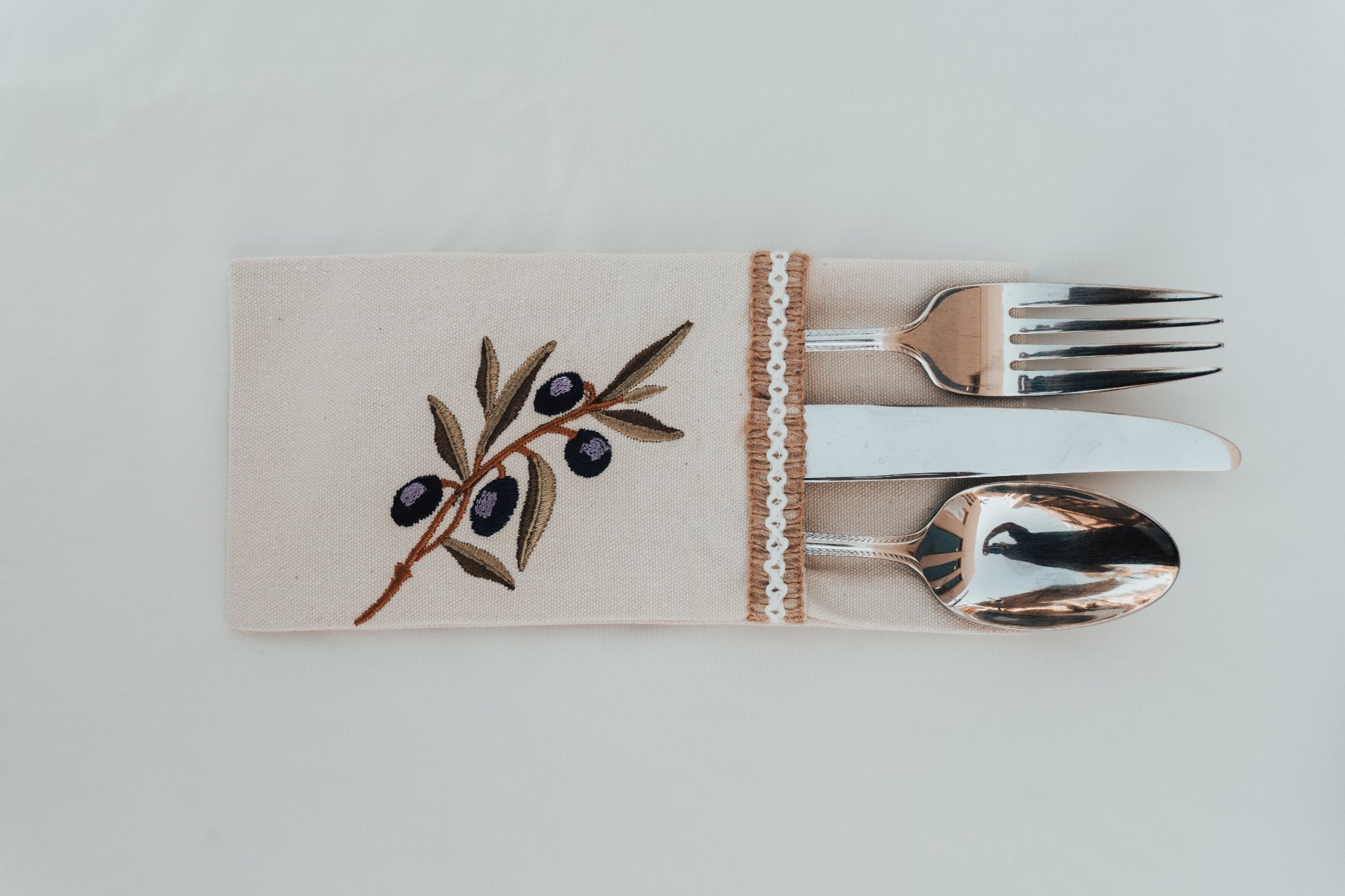 Set of 6 Handmade Cotton Canvas Cutlery Pocket with Palm Tree Embroidery – Tropical Theme, Made in Egypt